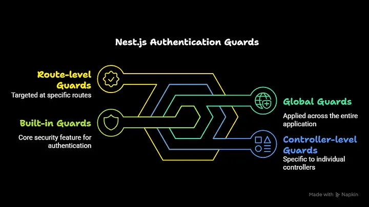 - Built-in Guards — Nest.js provides authentication guards that can be applied at different levels