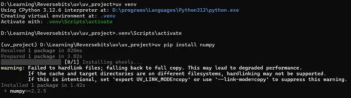 Short description: Let’s test uv by creating a virtual environment installing numpy and running that file. We would also make a requirements.txt file and also use it in another directory to install numpy.